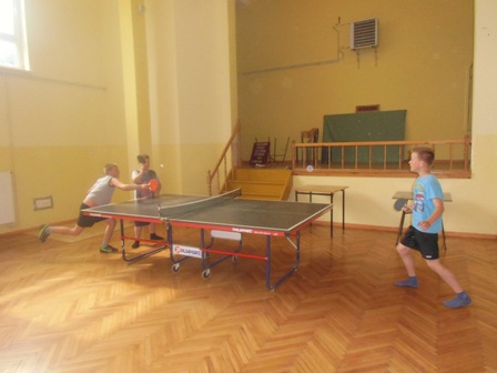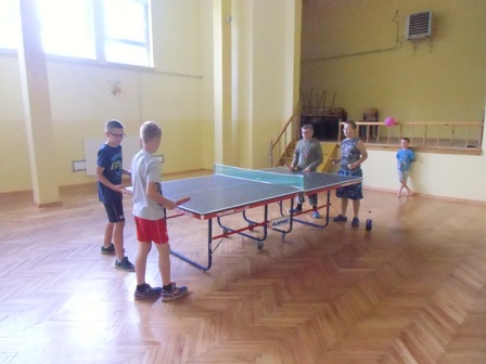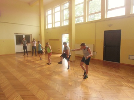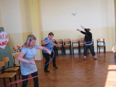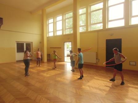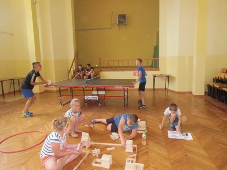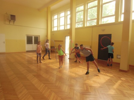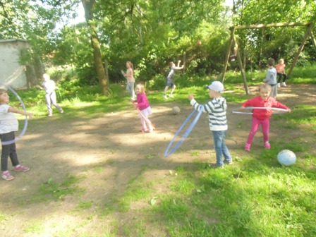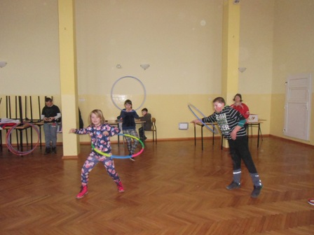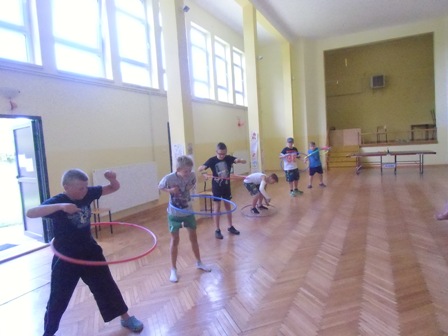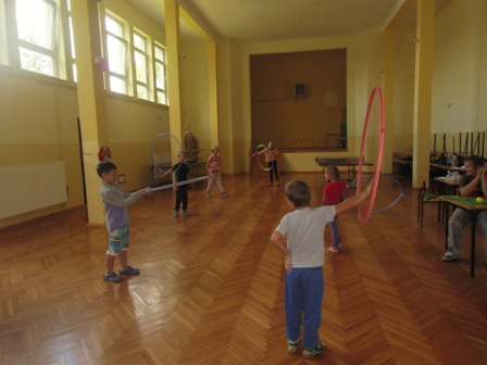ze skakanką , z kółkiem hula-hop, gra w kręgle, w ping-ponga,