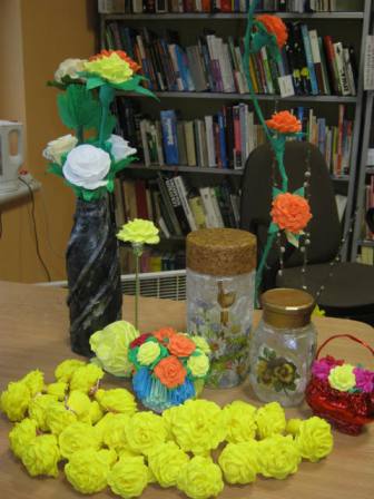 „Aktywni z pasją” – to grupa działająca przy naszej Bibliotece od 2012 r.. Na spotkaniach(w środy) dzielą się swoimi pasjami w zakresie rękodzieła : z wikliny papierowej - wyplatają koszyczki, doniczki, choinki itp., metodą decoupage – zdobią przedmioty, z bibuły wykonują piękne kwiaty itp.